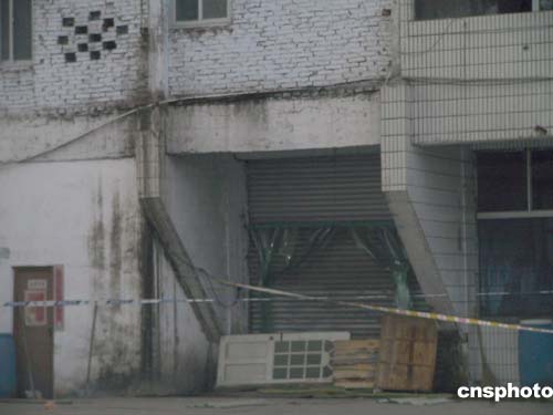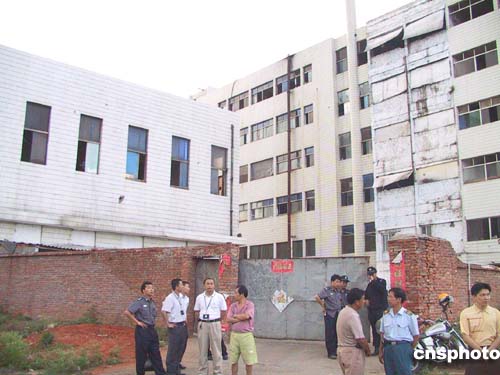 工廠由兩幢半拉子樓組成,樓房顯得很陳舊,一些窗戶甚至沒有玻璃,黑洞洞地呲著嘴。正對(duì)院門的大樓據(jù)說是生產(chǎn)車間,高六層。大樓中間是電梯井房,但沒有安裝電梯。廢棄的電梯井房便被工廠當(dāng)作生產(chǎn)浸泡水池。一樓電梯井口的鐵制卷閘門被嚴(yán)密地拉下,前面還擋了一塊門板和一條警戒線。
