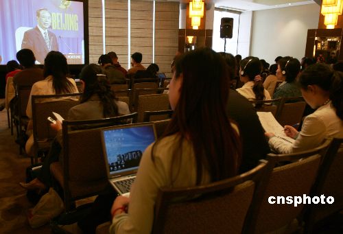 2005北京《財富》全球論壇5月17日在北京釣魚臺國賓館舉行,國務(wù)院副總理曾培炎出席首次會議并發(fā)表演講。因為絕大多數(shù)記者不能進入會場,只有在新聞發(fā)布廳觀看電視轉(zhuǎn)播。作者:任晨鳴