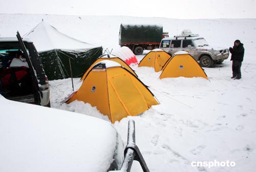 探險(xiǎn)隊(duì)野外搭起橙色帳篷 風(fēng)雪宿營(yíng)(圖)