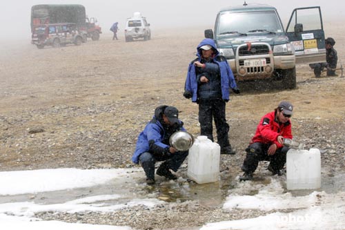隊(duì)員野外取水并將大桶飲用水運(yùn)送上車(圖)