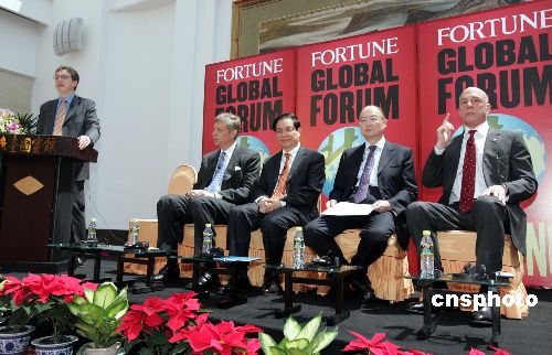 2005北京《財(cái)富》全球論壇5月18日專門舉行“中國銀行業(yè)改革近況”會議,中國銀監(jiān)會主席劉明康(左三)、國家開發(fā)銀行行長陳元(右二)用嫻熟的英語坦誠地與麥肯錫公司亞洲區(qū)董事長鮑達(dá)民(左二)、安永會計(jì)師事務(wù)所合伙人羅德曼(右一)等人對話。作者:任晨鳴