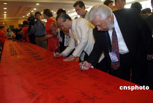 由國務(wù)院僑務(wù)辦公室和中國海外交流協(xié)會(huì)主辦的“第三屆世界華僑華人社團(tuán)聯(lián)誼大會(huì)”五月十九日在北京開幕,圖為與會(huì)代表在“增進(jìn)共識(shí)凝聚力量反對(duì)臺(tái)獨(dú)促進(jìn)統(tǒng)一”橫幅上簽名。作者:張勤
