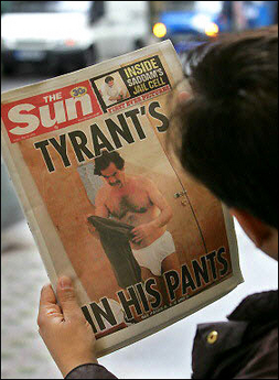 當(dāng)天《太陽(yáng)報(bào)》刊登的這組照片題為“薩達(dá)姆的監(jiān)獄生活,先睹為快“。在頭版的一張照片中,薩達(dá)姆上身赤裸,只穿著白色內(nèi)褲,手里拿著衣服,身后是一扇沒(méi)有上漆的木門(mén)。