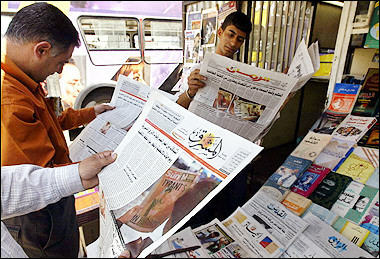 5月21日的《阿拉伯每日新聞》在頭版刊登了一副薩達姆的獄中照片,圖片上薩達姆在洗衣服。圖為伊拉克人在報亭閱讀該報。 春風(fēng)