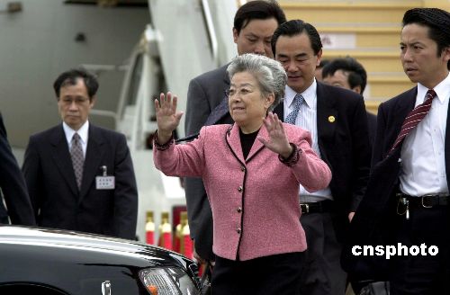 中國國務(wù)院副總理吳儀五月二十二日下午抵達東京羽田機場,繼續(xù)她的日本之行。圖為吳儀在機場向前來歡迎的當?shù)厝A僑和留學(xué)生代表招手致意。作者:王健