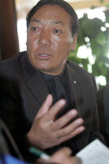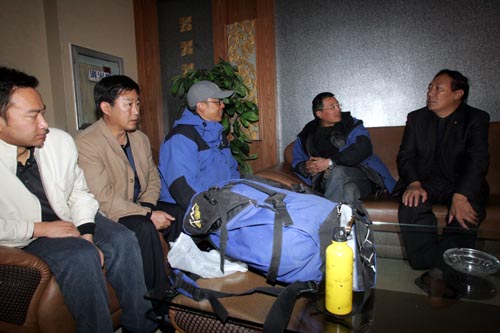 穿越可可西里聯(lián)想鋒行探險隊向可可西里國家級自然保護區(qū)管理局捐贈兩臺聯(lián)想電腦。圖為可可西里國家級自然保護區(qū)管理局局長才嘎在西寧小天鵝賓館探望此間下榻的探險隊員。