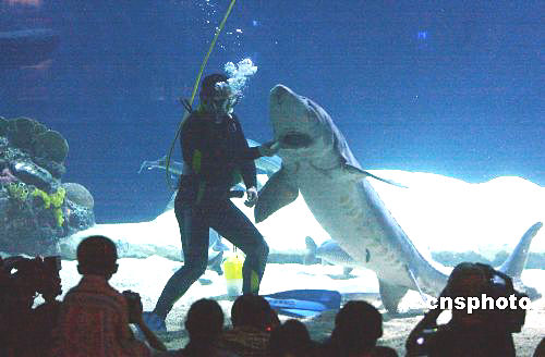 五月二十六日,觀察科研人員在水下對中華鱘投喂鯽魚。從第一尾國寶級中華鱘進入北京海洋館至今,二十六尾中華鱘已經(jīng)完全適應人工喂養(yǎng)。作者:韓藝冰