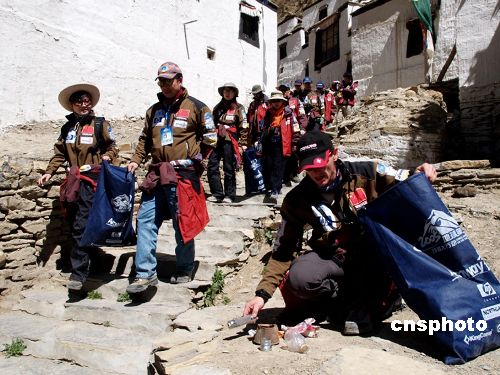 | 5月26日,“2005地球第三極珠峰大行動”志愿者一行,在當(dāng)?shù)夭孛窈陀慰蛡児餐瑓⑴c下,對位于西藏定日縣境內(nèi)海拔4400米的協(xié)格爾曲德寺進(jìn)行了清掃和環(huán)保宣傳活動。協(xié)格爾曲德寺創(chuàng)建于1385年,是一座依山而建的古寺。一上午的清掃工作成果頗豐,沿路的山洼里有一些多年無人問津的“死角”,滿是鐵皮手電筒,廢棄電池,鋁制飲料罐等對環(huán)境危害極大的不可降解性垃圾。作者:王驥
