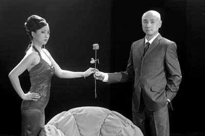 5月30日下午,記者走進(jìn)煤礦文工團(tuán)的安源小劇場,只見陶虹身穿一件紫紅色的露肩晚禮服,徐崢則穿著一身筆挺的西服。他們兩人分別站在一個(gè)紅色布藝沙發(fā)的兩側(cè),頭頂上是大量的聚光燈。劇場里的陣勢和時(shí)尚節(jié)目的拍攝別無二致?墒,陶虹、徐崢卻是在為他們二人主演的戲劇《最后一個(gè)情圣》拍攝電視宣傳片。