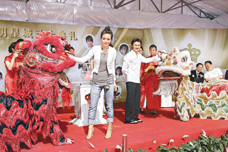 昨日英皇集團(tuán)主席楊受成,率領(lǐng)容祖兒、謝霆鋒、鄭希怡(Yumiko)、王杰、陸毅和瞿穎飛赴上海,為預(yù)計(jì)二○○七年三月落成的“明星城”進(jìn)行動(dòng)土儀式,而成龍因?yàn)闄n期問題而未能出席,現(xiàn)場有醒獅點(diǎn)睛和掛紅儀式,過百名記者爭相采訪,加上數(shù)百市民湊熱鬧看明星,場面熱鬧。