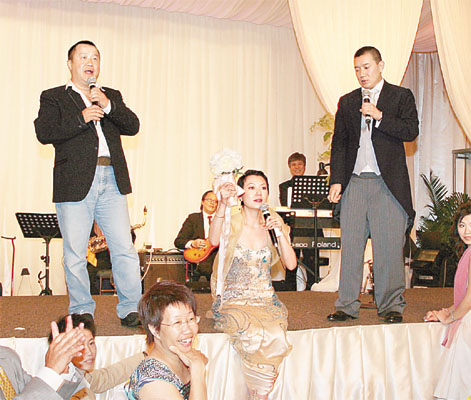 席間二人四出敬酒,曾志偉不時(shí)主動(dòng)向一對(duì)新人出手狂敬紅酒,二人很快便見(jiàn)醉意,新娘子更需要回房間休息片刻回氣。直至宴會(huì)尾聲,黎明、曾志偉和陳小春等好友堅(jiān)持要與杜汶澤共迎生日(8日),眾人情緒高漲,沖上臺(tái)合唱,醉至頂點(diǎn)的阿澤放聲高唱,田蕊妮亦醉得需要由姊妹攙扶才能上臺(tái),眾人合唱了《月亮代表我的心》、《友情歲月》、《L.O.V.E》等歌曲。