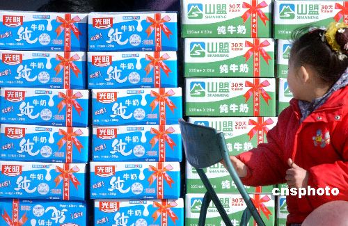 | 河南媒體近日?qǐng)?bào)道了鄭州光明山盟乳業(yè)有限公司“變質(zhì)光明牛奶返廠加工再銷售”一事。對(duì)此,鄭州光明山盟的控股方——光明乳業(yè)股份有限公司當(dāng)日發(fā)布了“誠(chéng)告消費(fèi)者書”,稱“鄭州光明山盟從來(lái)沒(méi)有做過(guò)‘將變質(zhì)牛奶返廠加工再銷售’的行為”,但也坦承光明在管理上存在疏漏。圖為2005年3月13日鄭州街頭促銷的光明純牛奶和光明山盟純牛奶。作者:馬健