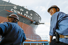 2003年6月,“中國(guó)航運(yùn)股份有限公司”向上海外高橋有限公司訂造了兩艘17.5萬噸好望角型散貨船,今天命名交付的“中華和平”號(hào)便是其首制船。它比原定日期提前110天完工交船,并將于今天下午啟航向首航目的地、南非理查德灣進(jìn)發(fā)。