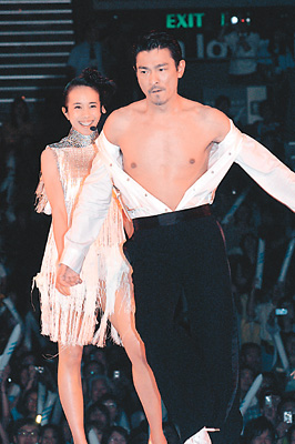 早前彩排時,Karen已透露會跟靚仔嘉賓劉德華大跳辣身舞,當晚雖然男友馮德倫出現(xiàn)監(jiān)場,惟不影響Karen的豪放表演。與“華仔”跳辣身舞時,動作大膽,只見“華仔”自Karen的玉背一直摸到她的屁股位置,看得觀眾嘩聲四起;跟著她更投向“華仔”的懷抱,將長腿鉗住對方,繼而慢慢將“華仔”的衣衫逐件脫下來。與此同時,“華仔”亦不甘示弱,把Karen的外衣脫去,剩下一條貼身低胸的白色連身裙;Karen亦一手把“華仔”的恤衫扯開,令“華仔”兩點盡露,全場觀眾尖呼狂叫。被脫光上衣的“華仔”即轉(zhuǎn)返后臺,而兩位男舞蹈員出場,繼續(xù)把Karen的長裙除去,最后只剩下白色bratop和短褲,非常誘惑。