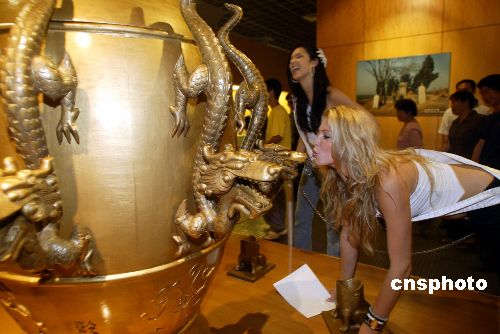 六月十一日,參加二零零五國際旅游小姐冠軍總決賽的來自七十五個國家和地區(qū)的佳麗,來到河南省鄭州市,開始河南巡游之旅,暢游美麗中原,感受黃河風(fēng)情,體驗(yàn)悠久歷史。圖為鄭州河南博物院根據(jù)歷史記載復(fù)原的地動儀吸引參賽佳麗。作者:盛佳鵬
