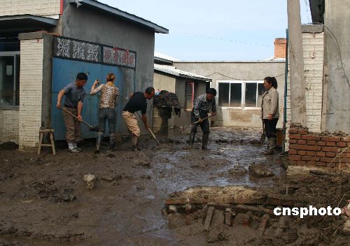 圖:洪水過后沙蘭鎮(zhèn)居民清理門前淤泥