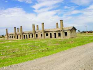 大約距該鎮(zhèn)六七公里處,在公路西側(cè)有兩棟灰色的水泥磚砌成的平房,房子上面的煙囪很高,比平房高出兩三米,與中國(guó)的建筑迥然不同。每棟房10個(gè)房間,每個(gè)小間大約12平方米左右,爐子在房前,在外面生火。室內(nèi)已經(jīng)殘損不堪,地炕式的床鋪,上面是榻榻米,室內(nèi)用火墻取暖。