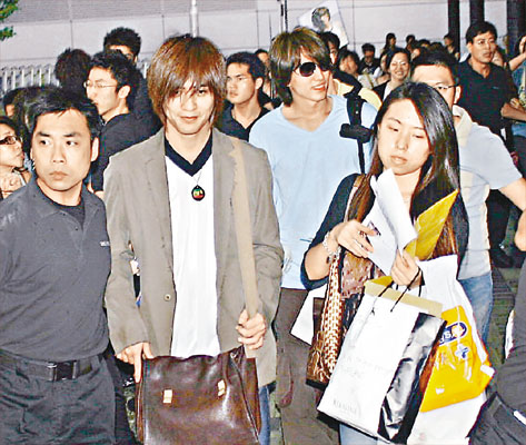 當(dāng)言、周二人出閘,fans欣喜若狂,場面一發(fā)不可收拾,三十多名保安、十多名警察嚴(yán)陣防亂。現(xiàn)場所見,明顯以言承旭fans的聲勢比周渝民強(qiáng)勁得多,難怪言承旭不時(shí)風(fēng)騷地向群眾揮手,反觀周渝民則頭耷耷,無厘神氣。最后二人在保安筑成人墻護(hù)送下登車離去。