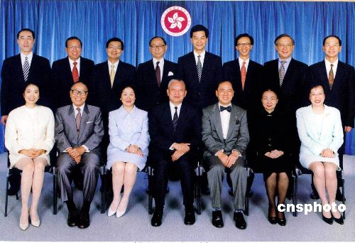 6月21日,國(guó)務(wù)院任命曾蔭權(quán)為香港特首。圖為1997年香港特區(qū)成立首屆行政會(huì)議成員合影。前排右三為曾蔭權(quán)。作者:中新社