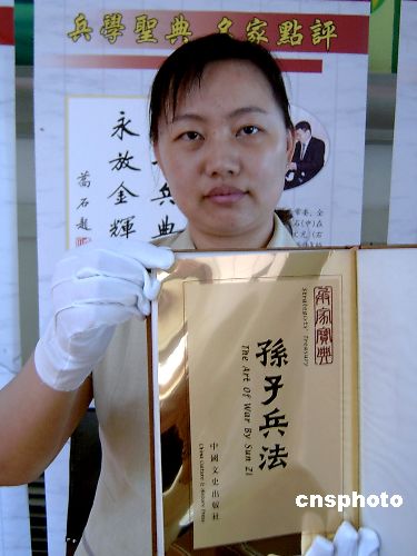 6月22日,發(fā)行人員在展示黃金版中英文《孫子兵法》。6月21日,該書在齊齊哈爾市博物館首發(fā),限量發(fā)行36套。黃金版《孫子兵法》為仿古籍16開本,40頁金紙,每套定價19600元。作者:王云龍