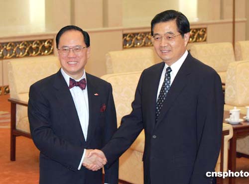 國家主席胡錦濤今天下午在會(huì)見香港特別行政區(qū)行政長官曾蔭權(quán)時(shí),希望曾蔭權(quán)先生不負(fù)眾望,恪盡職守,奮發(fā)進(jìn)取,為香港的繁榮穩(wěn)定和發(fā)展作出新貢獻(xiàn)。作者:毛建軍