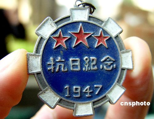 | 2005年6月26日,安徽淮北市一收藏愛好者展示一枚抗日紀念章。據(jù)收藏者介紹,1947年,中國共產(chǎn)黨為紀念抗日英雄楊靖宇烈士,在解放區(qū)范圍內(nèi)限量發(fā)行該紀念章,在紀念中國抗日戰(zhàn)爭勝利60周年之際,具有非常高的文物價值和收藏價值。紀念章的正面上方有三顆紅星,中間有“抗日紀念”四個字,下方有“1947”字樣。紀念章的背面有“東北民主聯(lián)軍司令楊靖宇贈”和“1947”字樣。作者:謝正義