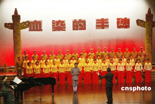 | 六月二十六日,為紀(jì)念中國工農(nóng)紅軍長征勝利七十周年和中國人民抗日戰(zhàn)爭勝利六十周年,曾參加過戰(zhàn)爭的老紅軍、新四軍、八路軍匯聚在北京解放軍歌劇院,參加在這里舉行的“血染的豐碑”紀(jì)念活動(dòng)。圖為北京新四軍研究會(huì)藝術(shù)團(tuán)、寶塔山合唱團(tuán)以及哈爾濱軍工校友合唱團(tuán)在活動(dòng)上演唱?dú)v史歌曲。作者:錢興強(qiáng)