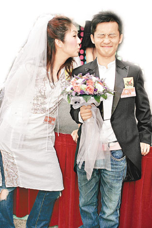 中新網(wǎng)6月28日電 據(jù)香港媒體報道,楊千嬅和林一峰昨日到銅鑼灣,出席《拉闊音樂會》的露天記者會,兩人以新郎新娘造型出現(xiàn)扮結(jié)婚,他們更即場作狀簽字和交換戒指,但簽字時突然下雨,搞到兩人十分狼狽,千嬅笑言連老天都反對兩人結(jié)婚,當千嬅讀誓詞時又忍不住笑,最后她把花球拋給林一峰。