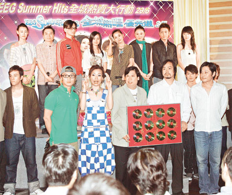 為挽救低迷唱片市道,英皇昨安排旗下歌手容祖兒、謝霆鋒、Twins、鄭希怡、達(dá)明一派、梁洛施、關(guān)智斌、Boy'z等齊集“1212+”餐廳出席記者會(huì),宣布將于暑假發(fā)起連串大型宣傳,包括Twins于七月一日踩入旺角,而七月三日英皇全體歌手將在九龍灣國際展貿(mào)中心舉行音樂會(huì)。