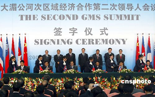 圖:大湄公河次區(qū)域領(lǐng)導(dǎo)人出席合作簽字儀式
