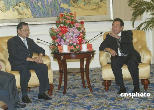 七月五日,中共中央臺辦主任陳云林在北京飯店會見臺灣華聚產(chǎn)業(yè)共同標(biāo)準(zhǔn)推進基金會董事長江丙坤。江炳坤率臺灣方面五十三人參加“海峽兩岸信息產(chǎn)業(yè)技術(shù)標(biāo)準(zhǔn)論壇”。作者:史利