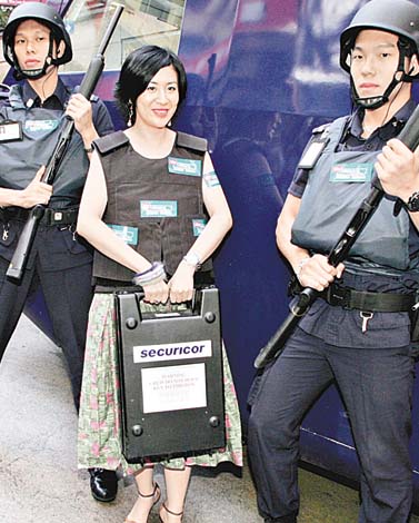為配合大會抽獎送鉆的主題,雖然只安排了大袋的仿鉆,但仍動用了正規(guī)保安公司護送。兩名保安員荷槍實彈左右護駕,由于途中路面不平,令君如十分擔心槍枝會否在碰撞下走火,她說:“支槍撞撞 ,都有想過會不會走火。這個感覺都好像真的, 以為自己拍戲時候的感覺!