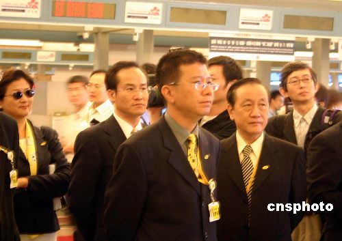 | 七月六日上午,新黨主席郁慕明(右二)與該黨“民族之旅”訪問團(tuán)成員在臺(tái)北桃園機(jī)場等候辦理登機(jī)手續(xù)。郁慕明在行前表示,此行主要是紀(jì)念抗戰(zhàn)勝利六十周年,進(jìn)行兩岸間的溝通協(xié)調(diào),與國、親大陸訪問團(tuán)不做比較,而是互補(bǔ)。作者:劉舒凌