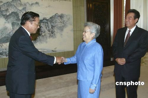 七月六日,中國國務院副總理吳儀在北京中南海會見率團來京參加“海峽兩岸信息產業(yè)技術標準論壇”的華聚產業(yè)共同標準推進基金會董事長江丙坤,并與訪問團一行合影。中共中央臺辦主任陳云林出席會見。作者:史利