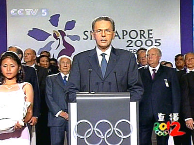 主辦城市選舉的懸念留到了最后一輪,由倫敦“決斗”同樣強大的巴黎。在這輪的投票選舉中,雙方?jīng)]有讓國際奧委會主席羅格難堪的戰(zhàn)成平手,而是高下立分。在經(jīng)過一段讓人幾乎窒息的等待之后,一位華裔新加坡女孩把放有結果的信交給了羅格。羅格在感謝了東道主新加坡民眾、此前提出申請的國家和五個候選國家后,向世人大聲宣布:國際奧委會決定,把第30屆奧運會的主辦權交給倫敦!