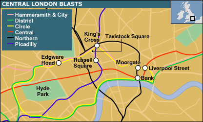 12點(diǎn)56分,英國內(nèi)政部官員告訴下議院,“一些恐怖分子攻擊”了倫敦中部。其中包括至少四次的爆炸。其中三起發(fā)生在地鐵,一起發(fā)生在公共汽車。羅素廣場(chǎng)和國王十字車站、摩爾門(Moorgate),歐德門和利物浦大街車站(Aldgate and Liverpool Street Underground),愛德華爾路車站(Edgware Road station和發(fā)生巴士爆炸的達(dá)維斯托克廣場(chǎng)(Tavistock Square)。