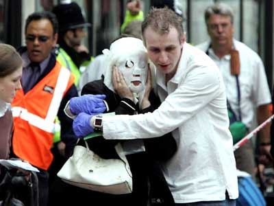 中新網(wǎng)7月7日電 據(jù)英國(guó)天空電視臺(tái)報(bào)道,當(dāng)?shù)貢r(shí)間7日倫敦發(fā)生了6起以地鐵公共汽車(chē)為目標(biāo)的恐怖襲擊,已造成至少90人傷亡。圖為救援人員護(hù)衛(wèi)一名傷者離開(kāi)現(xiàn)場(chǎng)。(春風(fēng))
