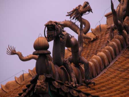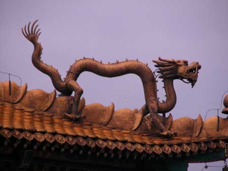 中新網(wǎng)7月9日電 承德“外八廟”之一的須彌福壽之廟主殿屋頂共有八條金色行龍,每條約重一噸,鼓目生威。