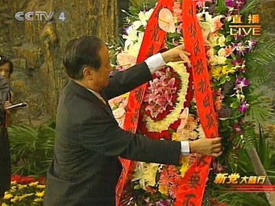 7月11日,新黨大陸訪問團參觀抗日戰(zhàn)爭紀(jì)念館。圖為新黨主席郁慕明向抗戰(zhàn)紀(jì)念館敬獻花圈。(央視截圖)