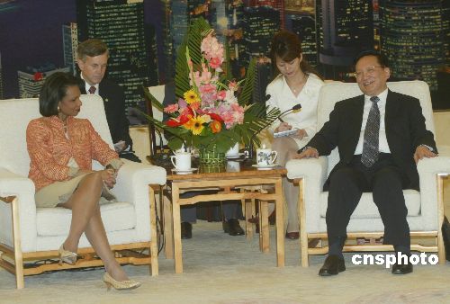 七月十日,中國(guó)國(guó)務(wù)委員唐家璇在北京人民大會(huì)堂會(huì)見來(lái)訪的美國(guó)國(guó)務(wù)卿賴斯。作者:史利