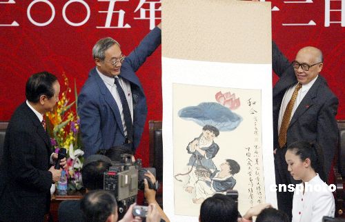 二、一幅名為“和合”的中國畫。“和合二仙”是中國民間傳說之神,有“和諧合好”,“婚姻和合”,“家人和合”等豐富含義,蘊(yùn)含著中國哲學(xué)的核心思想。“和合”還有“回家”之意,象征臺(tái)灣盡早回歸,實(shí)現(xiàn)統(tǒng)一。