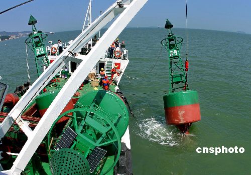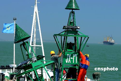 7月12日下午14時,在廈門東南海域離金門大擔島3000米處,一塊5噸重的定錨的沉石落下海中,帶著錨鏈的標有“Jx19”號的浮筒投入水中,上海海事局廈門航標處為廈金航道廈門航段拋下了第一座航標,將結(jié)束廈金直航航線“有航線無航道”的狀態(tài)。作者:藍添藝