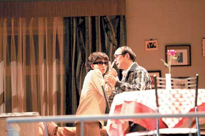陶虹在全場最“正!钡拇虬绫闶堑谌齻(gè)中年婦女的角色,一頭規(guī)矩的黑發(fā),身穿土黃色的、式樣頗為土氣的套裙,手中拎的白色皮包也是極盡規(guī)矩。從首演效果來看,陶虹的三次“變身”還算成功,三個(gè)反差極大的人物造型給她的表演助了一臂之力。