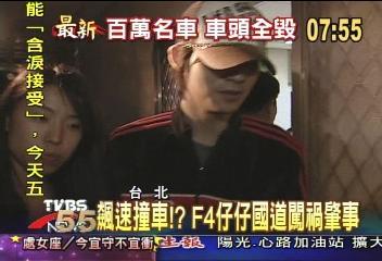 原來仔仔凌晨和兩名朋友回家途中,打算由內(nèi)側(cè)車道超車,一時(shí)失控,連撞兩部轎車,最后打滑碰到護(hù)欄才停止,仔仔的跑車當(dāng)場面目全非,還好幸運(yùn)的是,所有的人都沒有大礙。警方到場處理,經(jīng)過酒測確定仔仔沒有喝酒,可能是車速過快,才會釀禍,經(jīng)紀(jì)公司表示,這次意外造成的損失,他們會想盡辦法處理,周渝民也承諾盡到賠償?shù)呢?zé)任。