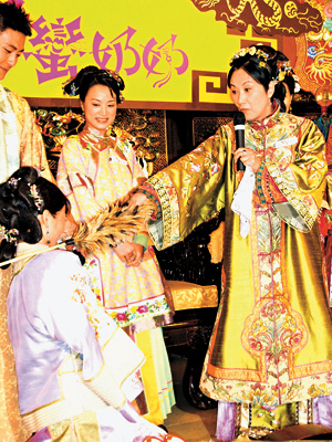 中新網(wǎng)7月13日電 據(jù)香港《大公報》報道,“無線”將于下周一推出新劇《我的野蠻奶奶》,昨日一班演員包括汪明荃、胡杏兒、黃宗澤及伍詠薇等,特地穿上清裝到珍寶海鮮舫舉行“新抱入門儀式”宣傳活動。期間“阿姐”、杏兒及Bosco(黃宗澤)除了Rap唱主題曲之外,“阿姐”更如野蠻奶奶“上身”般,向杏兒訓(xùn)示媳婦入門家規(guī)時喝令她跪下,之后送杏兒繡花鞋、樹葉及雞毛掃,“阿姐”道:“送樹葉是希望你開枝散葉,我看你晚晚都沒空!倍觾阂膊皇呛闷圬(fù),斟茶時即對“阿姐”道:“小心嗆到!”