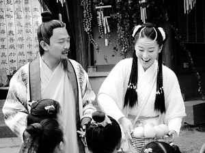 其實這段老年裝的戲原來在劇本中是沒有的,但導演認為如果加一段老年戲會讓整個劇更加充實,所以臨時改戲。原本是考慮讓吳宗憲和苗圃這一對戲里的小夫妻都化老妝,但可惜的是苗圃臉上的皮膚實在是太緊了,怎么化都老不了,最后只能把吳宗憲一個人扮老,苗圃只能屈就著演他孫女了。這是吳宗憲第一次以老年造型出現(xiàn)在電視熒幕上,自然很新奇,也很受期待。他一化完妝馬上跑到大家面前展示,但還不改貧嘴本性自夸說自己老了都這么帥,所以又是拍照留念,又是擺造型的,惹得劇組人員哈哈大笑。(蓋云飛)