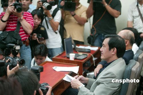 七月十六日晚,中國國民黨主席選舉揭曉,臺北市長馬英九高票當選。圖為馬英九在臺北國民黨中央黨部記者會上發(fā)表獲勝感言。作者:盛佳鵬