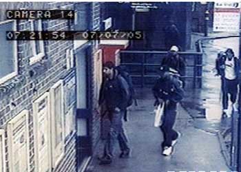 倫敦警察廳16日公布7·7爆炸案嫌疑人錄像,在這張盧頓車站錄像截圖上可看到:哈西卜·侯賽因(左一)、赫爾馬因·林賽(左二黑帽)、穆罕默德·西迪克·汗(白帽)和謝赫扎德·坦維爾在7月7日晨7點(diǎn)21分背包進(jìn)車站,此后四人在國(guó)王十字車站各自走上不歸路