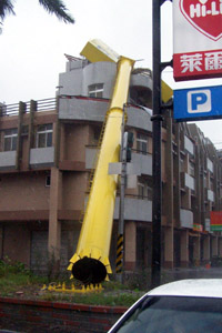 彰化市一家海鮮餐廳三層樓高的廣告招牌受強風吹襲斷裂,壓毀兩棟民房,幸無人傷亡。