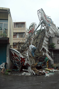 高雄縣橋頭鄉(xiāng)一座大型鐵制廣告廣告牌被強風吹倒,壓到對面民宅。